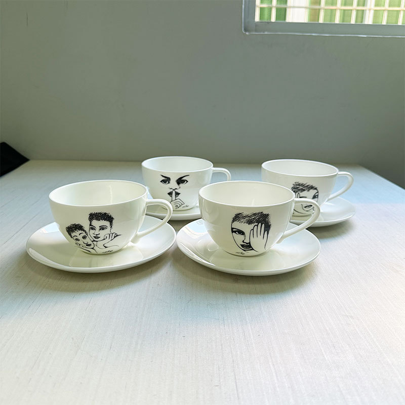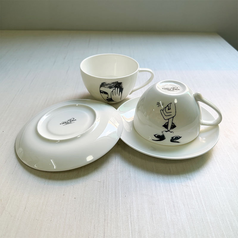 Carrol Boyes, an abstract figure from South Africa, is used in home and office settings. He has water cups, teacups, coffee cups, saucers, and creative dessert plates.