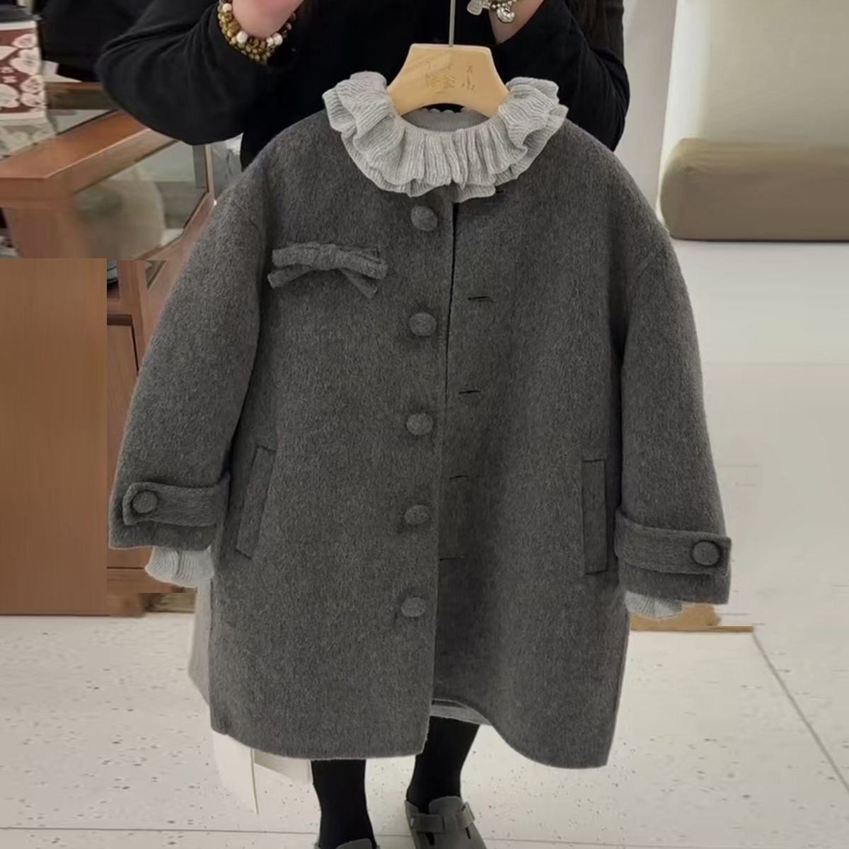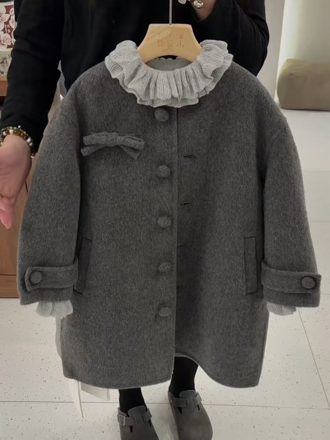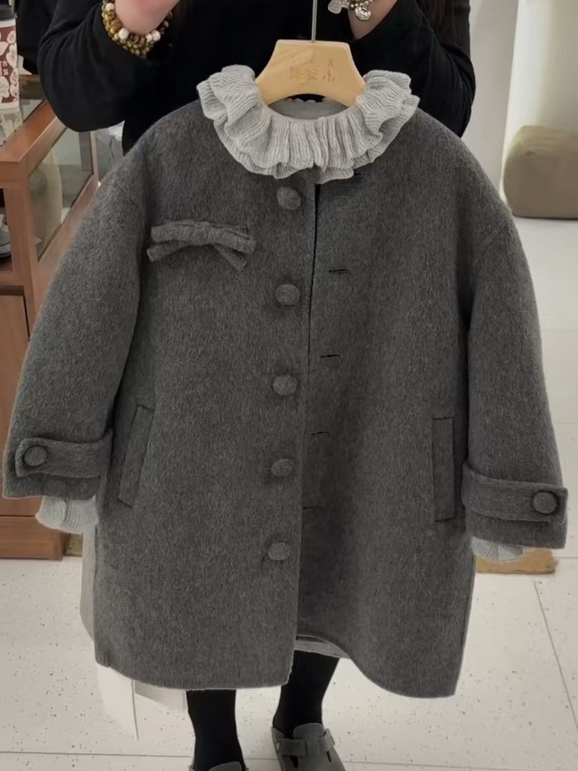 Thickened Wool Coat With A Gray Bow A Vintage Elegant Wool Outerwear Piece For Girls